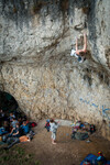 rechts der höhle, stark überhängende boulderroute, selten mal richtig trocken.