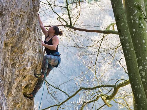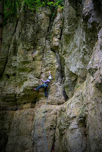 Schattiges Wändchen mit knackigen Problemchen. Deckt einen weiten Schwierigkeitsbereich ab von moderat bis SEHR sportlich.