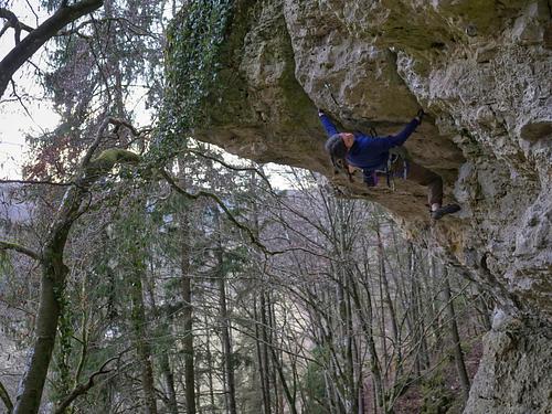Dunkles Eck mit netten Überraschungen von Plaisir über Abenteuerlich bis Hart. Nicht alles ist sauber, nicht alles ist fest. Helmpflicht und Vorsicht ist angesagt! Das Klettern hier ist zwar prinzipiell nicht verboten aber vom Grundstückseigentümer nicht gern gesehen. Im Konfliktfall bitte defensiv bleiben und das Feld räumen. Die Routen werden von links nach rechts im Uhrzeigersinn gelistet. D.h. die Routen auf der stark überhängenden Seite der Höhle werden als letzte aufgeführt.