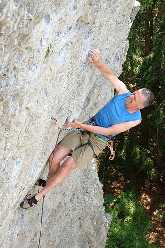 Kleingriffige Einzelstelle in Wandmitte, ansonsten gängig. Absicherung:sehr gut / wie Kletterhalle