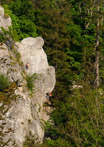kleine paraalpin-bastelstunde, lohnend und zahm zugleich, da einem auf dem weg zur drei-sterne -aussicht das material geradezu vom gurt gerissen wird. PREISFRAGE: wie bekommt man am besten die sanduhrschlinge durchs siebenschläferklo? genau: einfach runterspülen :D aber dabei einem ende festhalten! ;) Der große Felsblock unmittelbar links neben dem Abseilring ganz oben ist etwas locker. Vorsicht also beim Anklettern! -
