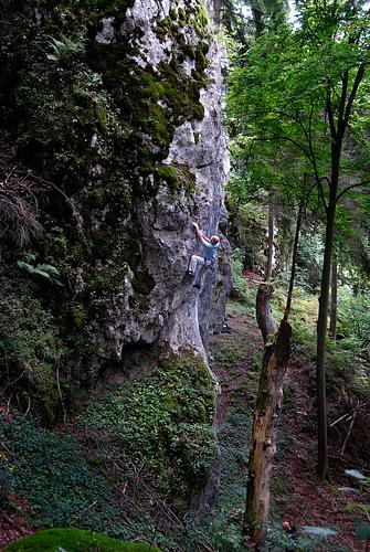 Eigentlich sehr schöner und gemütlicher Einstieg - jedoch echt richtig staubig und dreckig. Dafür wird man dann mit einem frankentypischen Dachboulder belohnt (nachdem man sich mit den Riesenspinnen in den Griffen angelegt hat) und kann die technisch anspruchsvollen Meter des Ausstieges rausturnen. Fand die Tour gar nicht so viel leichter wie die "Uferlos" -
