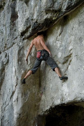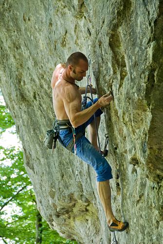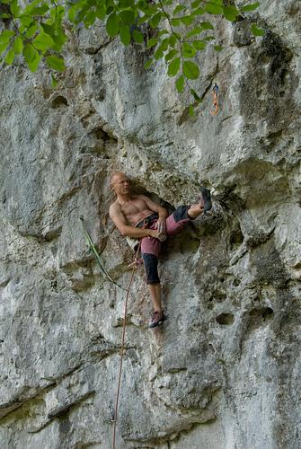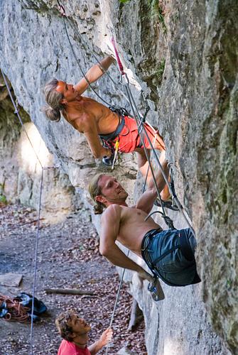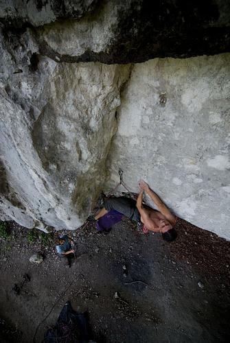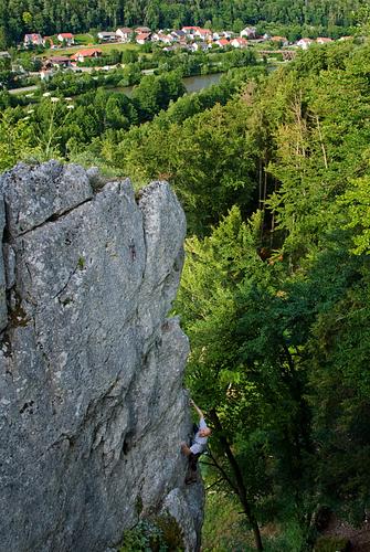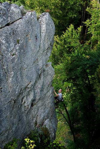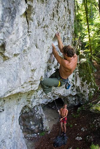 Nettes frankenartiges Gehampele. Leider lange feucht. An der Schlüsselstelle hängt die Schwierigkeit auch davon, ab ob man den Bold zum Klippen verlängert. (Oder wurde das schon eingerechnet?? Also ich lass die zwei Laschen beim Klippen einfach aus und hänge nur die Bühler ein, dann ist das Einhängen kein Problem. durch den ausgeprägten hallencharakter bestes altöltaldefizittraining. der ewige schleim in der tour "gehört einfach dazu", denn er ging wohl mit in die bewertung ein. aber immerhin sind die schlechtesten griffe auch die trockensten. hmm, vielleicht könnte man ja zur schonung der haxen die einflugschneise etwas ausheben und mit dem zeug unterm abstoß den erodierten hang wieder aufschütten, ebenfalls zur haxenschonung? allerdings gibt’s dort ja inzwischen auch ne ganz ehrliche einstiegslösung. -