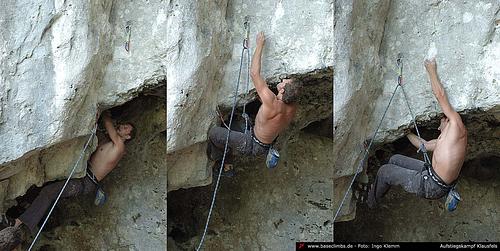 Ein Podest am Einstieg (so ca. 1m hoch) wäre nicht schlecht um an die Startgriffe richtig ran zukommen, ansonsten super Tour. Der Sprung im Einstieg gehört aber eigentlich zur Tour ( und Bewertung ) dazu.... Nomen et Omen Wie Sprung? Spring ihr da gleich in das große Loch? Eigentlich dacht ich wäre die Schlüsselstelle zwischen dem 3. und 4. Haken, für uns war aber der Einstieg (bis zum 2. Haken) das schwerste. Is zwar schon 10 Jahre her, aber ich kann mich noch erinnern, dass man von der Seite ( also da wo es hangmäßig etwas höher ist, evtl. auch mit Stein ) mehr oder weniger einarmig an den Henkel springt. Vorklippen nat. sehr ratsam... Vielen Dank, in der Zwischenzeit habe ich auch vom Ebe die Info bekommen, dass er vom Einstieg gleich in das große Loch springt. nach langjähriger klausfels-abstinenz haben wir am samstag festgestellt, dass es rechts ursprünglich ein kleines mäuerchen gab, von dem man aus gestartet ist. wie Ingo schon beschrieben hat. man ist zumindest mit rechts an eine leiste rangekommen von der aus man dynamisch ins grösse loch gehangelt bzw gesprungen ist. Hab mir schon so was gedacht. Inzwischen hab ich aber eine Lösung von unten raus gefunden. Die zwei rechten Fotos gehören ziemlich sicher zum Aufstiegskampf und nicht zum Abstoß -