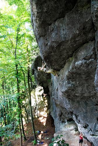 hat das auch nen namen? "Holger-Überhang" echt lässige, steile linie, die trotz abscheulicher rissoptik mit keinem einzigen zwingenden klemmer in die niveazarten patscherchen fräst! an sommernachtsphantastisch feuchtelnden löchern quert es sich flüssig und z.z.doch angenehm trocken bis zur schlüsselstelle. falls es da mal eng werden sollte, kann man auch ohne weitreichende ballistikkentnisse ein auslassen des folgenden hakens nur erprobten anhängern der sächsisch-böhmischen sprungschule empfehlen... fand ich gutmütig 8+. ps: mann holger, die tour hätte doch wirklich einen coolen namen verdient! -