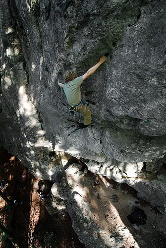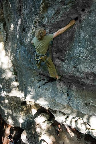 Der mayfels hat erneut zuwachs bekommen: und zwar nen extrem amüsanten vom basti direkt rechts von der laus. Die wand unten ist zwar auch gut, aber das lässigste ist ganz klar der überhang, der in formidabelst athletischen zügen erklommen werden darf und noch den einen oder anderen schlaraffiös gepolsterten rausschmeißer bietet. Kein einziger siffender griff (wie links um die ecke so üblich) trübt diesen großartigen spaß: henkel(l)-trocken, quasi – prost und machen! :D Ps: links unterm umlenker klemmt ne wackelige schuppe NOCH einigermaßen fest, also bitte besser die noch etwas erdigen henkel darüber bevorzugen! schöner und lohnender (neu)-zuwachs. ich würde aber anregen, das oben umzubohren, erstens ist momentan nicht offensichtlich wo es lang geht und zweitens ist ein sturz beim letzen hakens aufgrund des heftigen pendlers nicht wirklich lustig. und es wollen ja bestimmt auch leute in der tour ihren spass haben, die vor der begehung nicht wissen wo die griffe versteckt sind. nun, wie würdest du's denn haben wollen? zwangsläufigerweise hat basti den pendler ausgiebig getestet (und ich letztlich auch)... ist doch ne schöne und harmlose schaukel, viele gehen für sowas auf die dult! ;) bis sich der erste mal den kopf anhaut oder die füße wenn er ordentlich schlapseil kriegt. so wie das jetzt gebohrt ist, setzten sich erst mal die meisten leute oben rein, machen technisch hoch, checken aus und kletterns erst dann, eigentlich schade. und dass ganz bloß weil ein haken ( bewusst?) ungünstig gesetzt ist. im übrigen ist es nicht nur mir so ergangen. also nochmal die frage: wie wäre es denn deiner meinung nach besser gebohrt? ich finds sehr gut eingerichtet hinsichtlich klippposition und routenverlauf; wenn man fliegt, zieht es einen immer schön ins freie. die passage ist eben nicht offensichtlich (warte schon auf ellenlange ticks wie an schild oder f-ruh), und da kann man es m.e. ähnlich wie im space shuttle kaum auf die absicherung schieben, wenn man sich nicht traut, vom haken wegzuklettern. ;) voraussetzung ist natürlich wie in jeder anderen route auch, dass der sicherer mental anwesend ist und auch weiß was er tut. liegt doch eigentlich auf der hand, du hängst auf höhe des letzten hakens, hast nen guten griff in der hand und fragst dich warum der jetzt ohne erkennbaren grund soweit rechts ist dass du nicht klippen kannst... also, drei optionen: a) den vorletzten haken höher und einen guten halben meter nach links, dann bleibt es spannend aber ohne pendler, b) den letzten haken soweit nach links dass, man aus dem guten griff links klippen kann, c) die absolute weicheinvariante wäre dann a) + b) hihi, ich weiß, man kann fast reinbeißen, aber um's verrecken nicht klippen! :-D also, zieh halt weiter auf den henkel für links, von dem es sich bequemst einhängen lässt. ziag-oder-fliag! ich find's cool so, vor allem, da man es sich hier in der steilheit auch locker leisten kann (ganz ähnlich wie beim schnapper in pumping iron). sollte der untere haken versetzt werden, muss man aufpassen, dass man dadurch beim zug auf den o.g. henkel kein einfädeln mit rechts provoziert, was jetzt gut vermieden wird. tja, eben alles geschmackssache und dies nur meine meinung. jedoch fände ich es schade, würde dieser spannenden passage der erlebniswert genommen, da kaum noch solche routen entstehen, wo man zwingend aber unkritisch überm haken klettern muss. -
