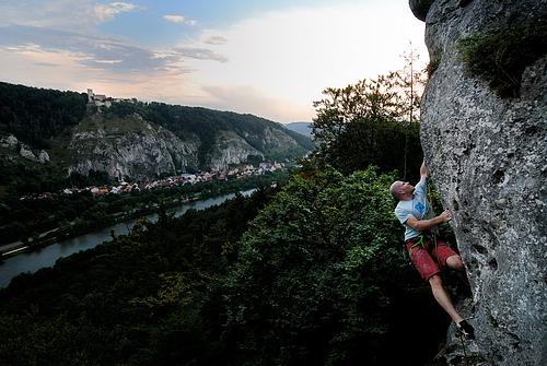 Einstieg wie "König von Essing", dann aber nach rechts abzweigen. Schöner Dynamo. Absicherung:klassisch