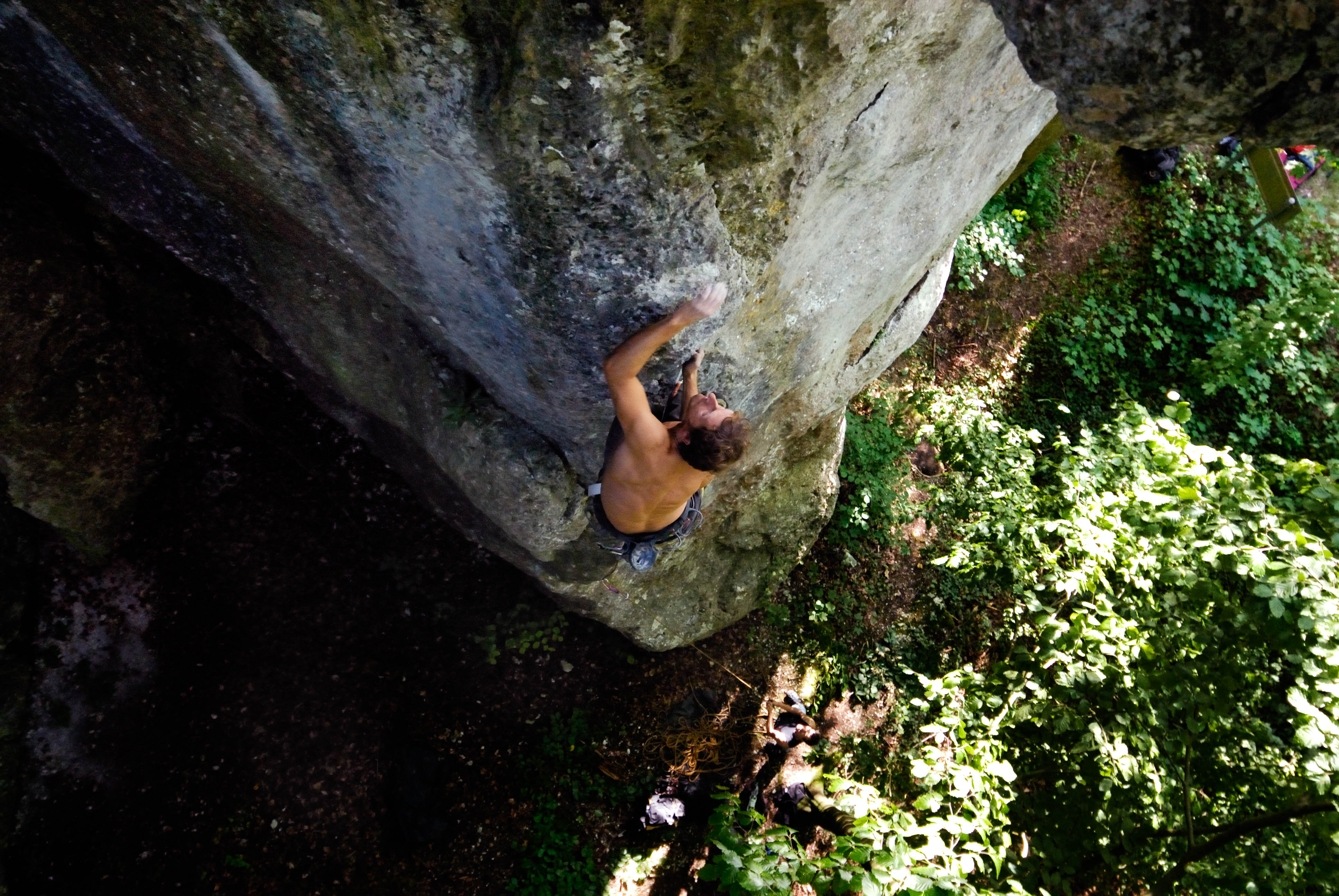 Ja, das Ding ist tatsächlich rp geklettert worden, da stand ich selber unten beim Sichern. Ich durfte mich im Rahmen der vorausgehenden Experimente auch versuchen (schön gemütlich im Toprope). Land gesehen habe ich dabei aber nicht. Das ist schon eine sehr garstige, schwer überhängende Stelle. Sieben halt. -
