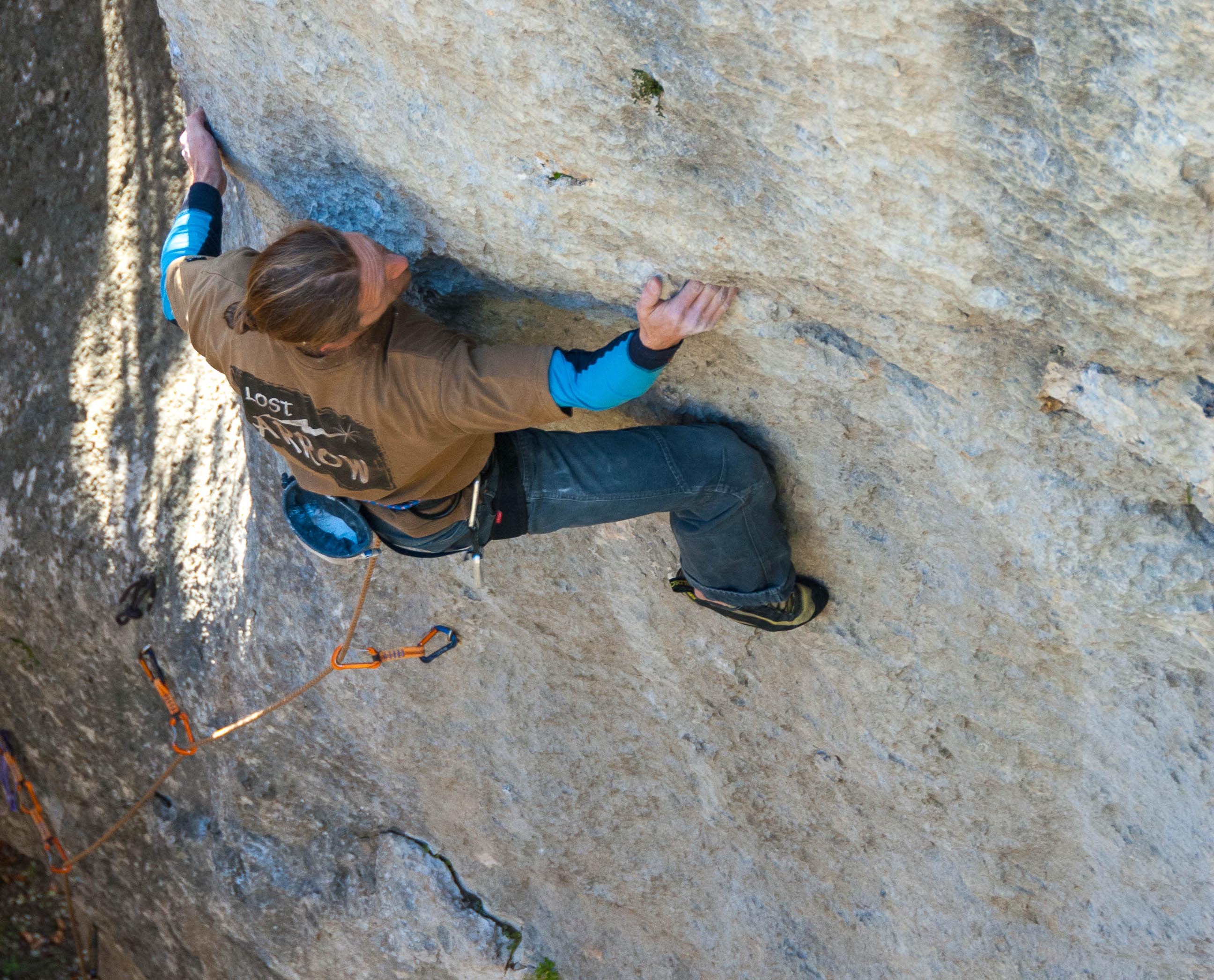 Super schöne Tour! Unten muss man sich ein paar Züge gut festhalten und anschließend bis zum zweiten Haken gut stehen. Dann lehnt sich das Gelände leicht zurück und es folgt ein schöner Zug nach dem anderen. Ob man dem Schnürchen vor dem ersten Bohrhaken vertraut muss jeder für sich entscheiden. Einen eigenen Umlenker habe ich nicht gefunden, die UL der Nachbartouren sind aber in Reichweite. -