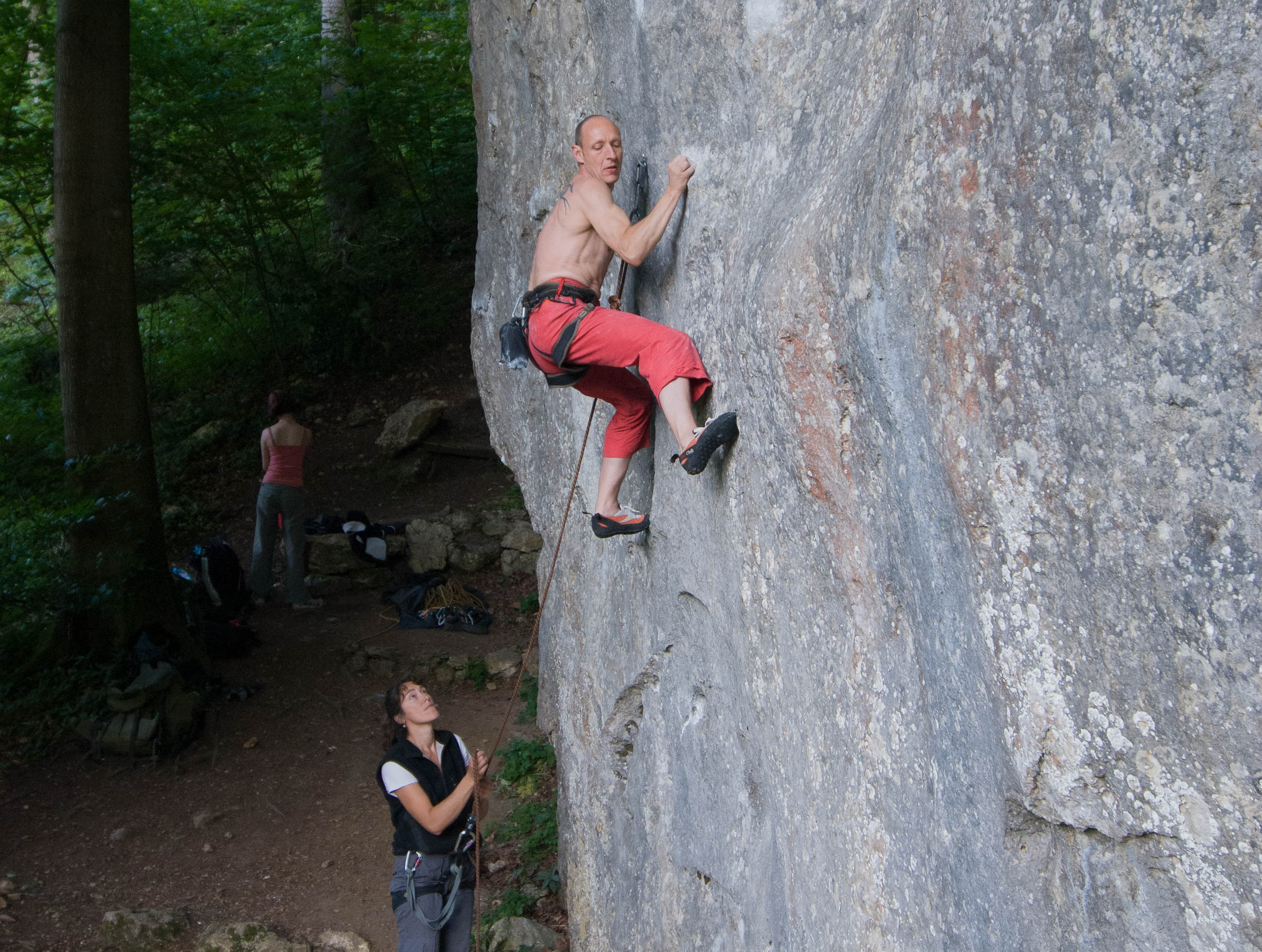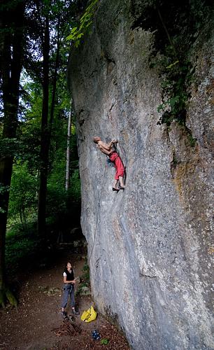 Erste Route am Fels Wurde damals als 7/7+ ohne den derzeitigen ersten Haken erstbegangen. Wäre in der Fränkischen Locker glatt 8... Absicherung:klassisch