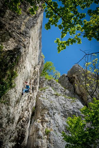 Diese Route ist aktuell wegen Vogelbrut gesperrt oder nur eingeschränkt bekletterbar.Supergeile Ausdauerklettererei mit 2 bis 3 Schlüsselstellen und zwischendrin nettem Erholungsgelände. Leider dauerhaft etwas bröselig was den Kletterspass aber nicht beeinträchtigt und gleichzeitig dafür sorgt, dass der SIchernde wach bleibt. NB: In diesem Wandbereich wurde von M. Leopold zu früheren Zeiten eine 9- (?) geklettert, deren Start, Verlauf und Ende allerdings aufgrund der wenigen belassenen Sicherungselemente bisher noch nicht reproduziert werden konnte. Sachdienliche Hinweise werden hier gerne entgegen genommen.... Absicherung:klassisch