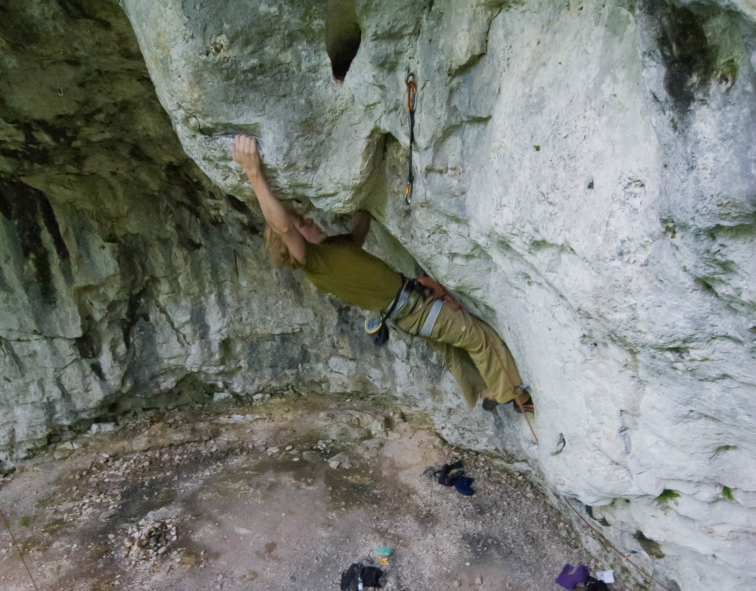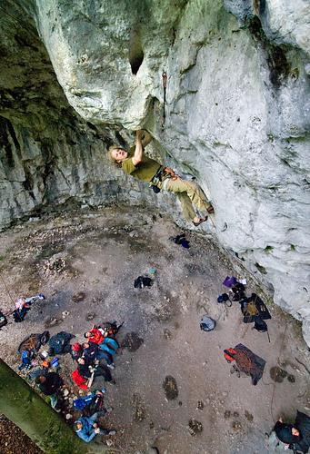 Die Henkel direkt rechts neben der Höhle könnten sich schon sehr bald verabschieden, was bei der Steilheit und der betroffenen Fläche sehr unangenehme Folgen für den Athlet sowie das Sicherungspersonal haben könnte. Lieber woanders aufwärmen. -