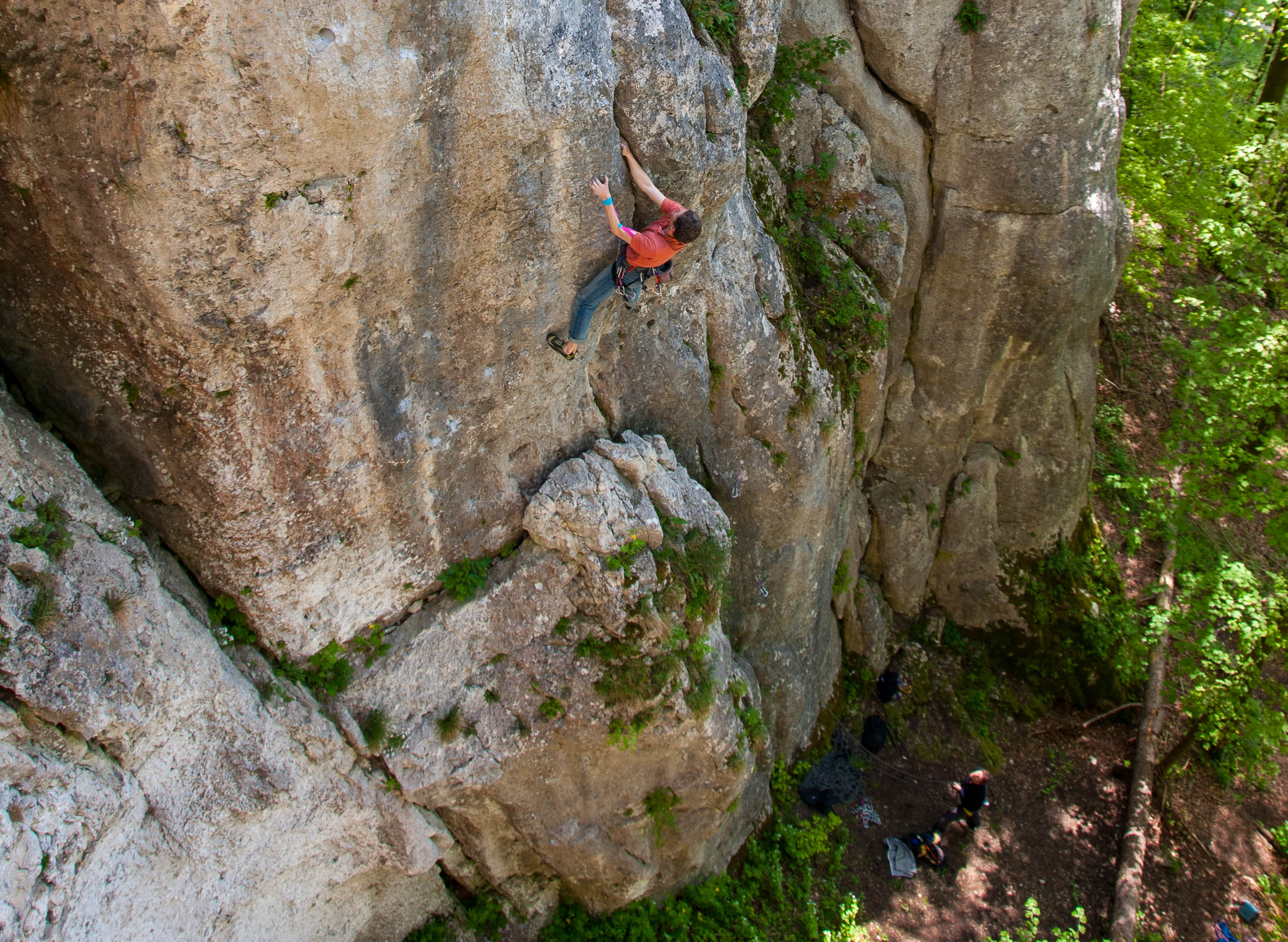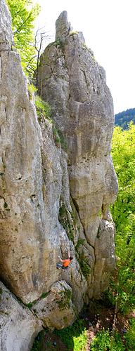noch so ne ausdauerperle hier, die nen positiven affenfaktor mit gutgriffiger athletik belohnt, ohne durch banale bewegungsaufgaben zu langweilen. beschränkte reichweite (< 1,75 m) hebt jedoch in der cruxpassage den individuellen anspruch deutlich an, oben nach dem rastpunkt dagegen wohl lediglich die zugzahl. Hmm, ist ja schon etwas her... wenn ich mich recht erinnere, war das war so ab dem Band gesehen in Wandmitte: ewig weiter Zug mit rechts auf nen Seitgriff mit relativ schlechten Tritten. Dann war's schwer, die Füße hochzukriegen (sehr hoch ansteigen mit links) um das aufzulösen. So ungefähr... ;-) Was ein genuss zu klettern wenn man der Tour gewachsen ist. Aber schon etwas schwer zu holen für 8+. Ich finde die Bewertung ok wenn man hin und wieder etwas links der Haken klettert. Aber ich hab mich auch schwerer getan, als in den meisten 9-en im Tal. Das liegt aber wahrscheinlich eher daran, dass die Anforderung an die Ausdauer Altmühltal-untypisch hoch ist und man das halt nicht so gewohnt ist. -