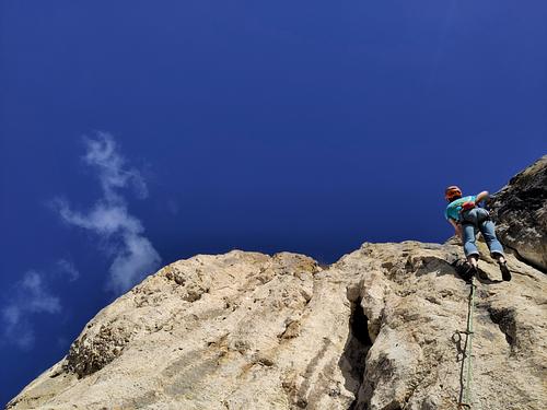 linkeste tour am fels, an finger- und handrissen unter den kleinen bauch und diesen rechts umgehen Absicherung:klassisch