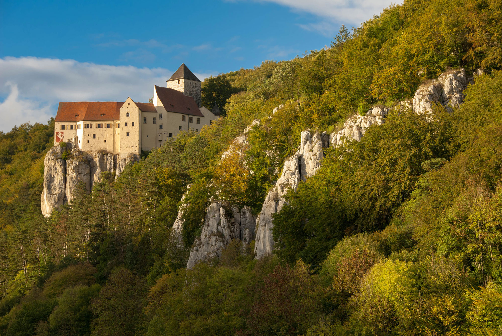 Nette Routen in großlöchrigem steilen Fels mit Blick auf die Burgruine Essing. Lohnen sich vor allem in Kombination mit der Chefetage. Vormittags tatsächlich sonnig.