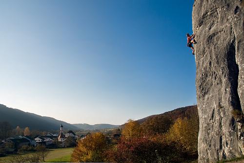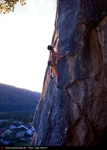 Der Klassiker und die Normtour im Altmühltal in für diesen Grad. Klassisch von unten erschlossen. Im Einstieg zwei Varianten möglich. (Original = grade rauf). Gewonnen hat man erst, wenn man die UL (frei!) geklippt hat. Langsam bürgert es sich ein, noch die paar Meter bis zum UL von "Ring frei" mitzunehmen... Gear: Zwischen 2. und 3. Haken kleiner Rock möglich. Zwischen 3. und 4. Haken mittlerer Rock [7er passt perfekt!] anzuraten, zumindest wenn man o.s. unterwegs ist und noch keinen Plan hat wie der 4. Haken zu klippen ist...Protection:classic