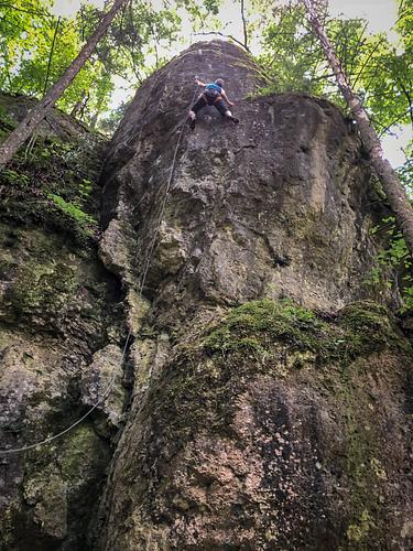 Super abgesicherte Kletterei am Bauch mit kleinem Runout zum Top. Für größere etwas leichter. Erstbegehung: Stephanie Peter Bewertungsvorschlag: 7+/8-