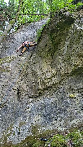 Oh ja, coole kleine Tour. Erstaunlich wie klein die Griffe in einer senkrechten 8+ sein können. 3-Zug-Crux, die den Grad bestimmen. Die ersten 10 m sind nur Zustieg, aber schön zu klettern.