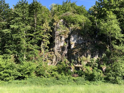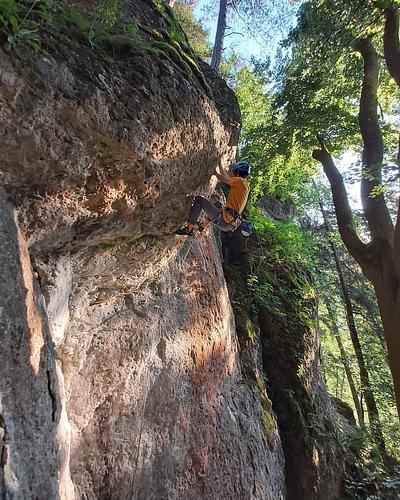Die Route ist von mir. Geklettert 2010 Name: "Rote Socke". Die beiden Touren links davon sind auch von mir. Der Überhang heißt "Lokalderby". Geklettert hat es damals der Sebi (oppelt) und hat es mit 8 bewertet. Ich fand es aber schwerer und hätte mich eher für 8+ ausgesprochen. Links davon hab ich auch noch eine Tour eigerichtet - die fand ich aber eher unschön und brüchig und deshalb ist mir kein gescheiter Name eingefallen.