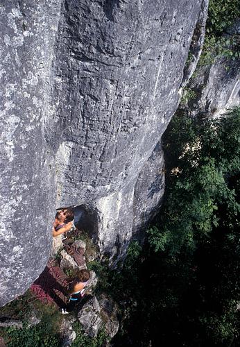 "bei bedarf" ist gut! ich hatte da jedenfalls mal großen "bedarf", konnte aber nix g'scheits unterbringen :-/ zudem schien der fels zum umlenker hin nicht sehr vertrauenerweckend... also, erste länge fand ich gut, trotz des specks, aber die zweite nicht so lohnend und eher anspruchsvoll: vom stand zum nächsten haken muss man sich schonmal gut festhalten fürn 5er, damit's einen nicht in der platte zerlegt. aber vielleicht war ja alles nur frühjahrspanik... ach ja, 70er seil reicht NICHT zum umlenken der kompletten route! vielleicht mal was historisches: es geht das gerücht um, daß die route anfang der achziger jahre clean erstbegangen wurde, nachdem eine gieskanne voll unkrautvernichtungsmittel über die platte gekippt wurde! das ist natürlich ultra-pfui, vielleicht auch nur ein gerücht! das die tour clean erstbegangen wurde glaub ich schon weil: 1984 war ein normalhaken und ein sticht-bohrhaken drin der normalhaken war da wo heute der 2 bühler steckt, aber nur für leute zu einhängen die groß genug waren. der sticht-bolt war da wo jetzt der 3. bühler ist und ist angeblich erst nachträglich dazugekommen! auf dem band war nix ausser einem dürren haselnussstrauch drüber war auch nix, und stand machte man oben an der immer noch mickrigen kiefer. Mit Friends der Gr. 1 – 2,5 kann man zwischen dem ersten und zweiten Haken und oben die Absicherung wesentlich verbessern, ergibt dann aber auch mächtig Seilreibung. dieses phänomen nennt man auch das viskoelastische raum-zeit-diskontinuum des neumodischen kern-mantel-bergseils: mal reicht's, mal eben nicht so ganz, je nachdem wer, wie, was, woher, wie alt, wie oft, wie fett... da sind 70 m eben nicht immer gleich lang und angesichts des blockigen einschlaggeländes geht man einfach besser gleich von letzterem aus, meine ich ;-) Geniale Route...moralisch gesichert :) Vorsicht da is a Hornissennest in der Tour. De san ned so erfreut wenn ma bei erna vorbei schaut! Würd vielleicht in da nächsten zeit de Tour eher meiden. 😅 -