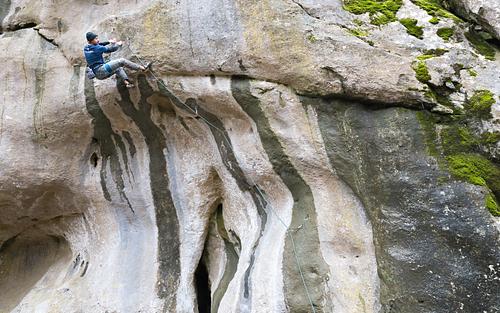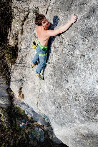 Super schöne Tour! Unten muss man sich ein paar Züge gut festhalten und anschließend bis zum zweiten Haken gut stehen. Dann lehnt sich das Gelände leicht zurück und es folgt ein schöner Zug nach dem anderen. Ob man dem Schnürchen vor dem ersten Bohrhaken vertraut muss jeder für sich entscheiden. Einen eigenen Umlenker habe ich nicht gefunden, die UL der Nachbartouren sind aber in Reichweite. -