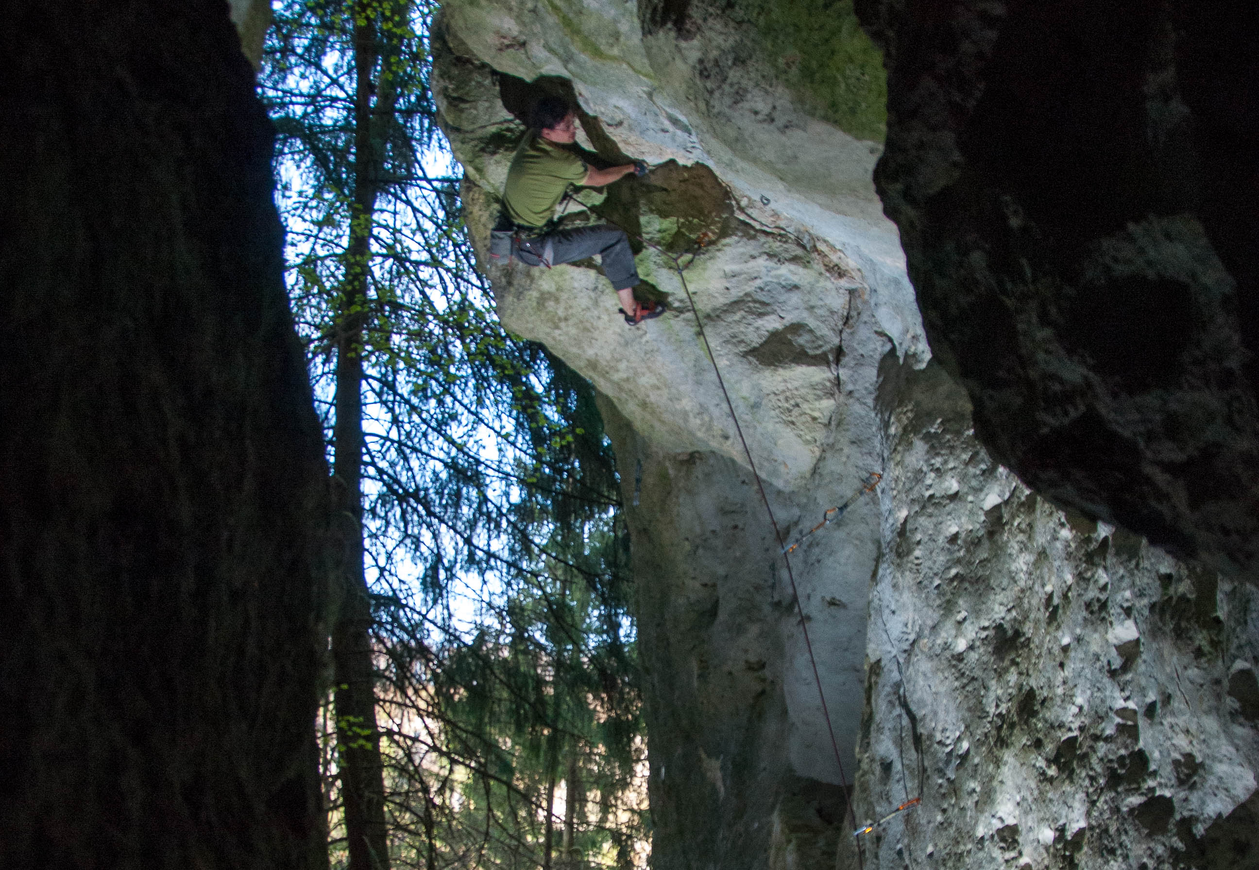 zwischen totentanz und dead man chalking gerade hoch unter überhang, dort nach links und zusammen mit totentanz zum umlenker, 6h + uh Protection:classic