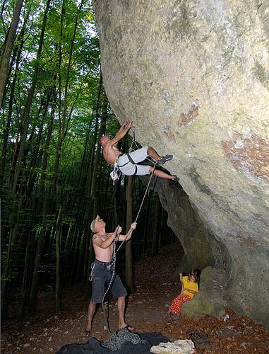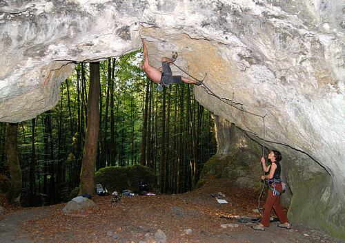 Startet ganz hinten in der Höhle, sozusagen direkt im Nirvana ;) Mal mit den Füßen, mal mit dem Kopf voraus, aber immer mit hooks und knieklemmern gehts stetig der Sonne entgegen. Nach dem ersten schweren Boulder kann man nochmal kurz schütteln, dann darf man noch die Jagdfieber-Crux dranhängen. Mit Abstand das steilste was das Labertal zu bieten hat (mehr Dach als Höhenmeter) :) Protection:classic