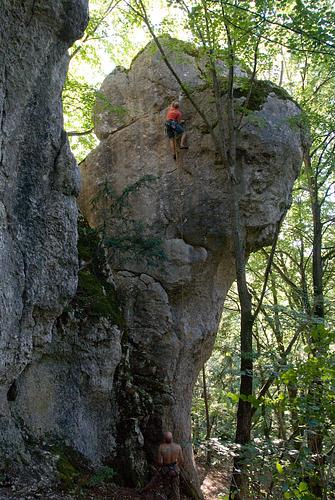 Die ehemals mäßig gesicherte "Krieger-Jürgen-Tour" hat drei zusätzliche Zwischenhaken und eine Umlenkung spendiert bekommen und kann nun als Aufwärmspass herhalten. Gibt es in Obereinbuch eigentlich noch mehr zum Sanieren? ACHTUNG! GEFAHR! Rechts vom 6. Haken befindet sich ein großer Block der nicht mehr solide verankert ist. Die Route besser momentan nicht oder mit großer Vorsicht klettern. Die Tour habe ich heute einer Sanierungsaktion unterzogen: Der grotesk falsch platzierte 3. Haken (Krieger-Jürgen-Gerüstanker) ist nun da, wo er sein muß. Den ungünstig zu clippenden 4. Haken (Bühler) habe ich nach rechts verlegt. Den 5. Haken (Gerüstanker) habe ich ersetzt. Der 1. Haken ist nach wie vor ein Gerüstanker; gewechselt habe ich ihn nicht, weil sich bei den beiden oberen Gerüstankern keinerlei Rost oder Lockerung gezeigt hat. Zwischen 4. und 5. Haken befindet sich ein Block, der sicher nicht mehr Jahrzehnte an Ort und Stelle bleiben wird. Mit schwerem Gerät könnte er sicher rausgehebelt werden. -